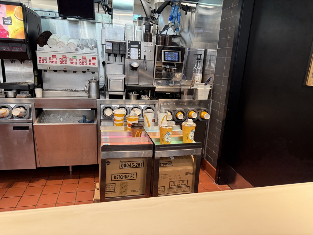 ドリンク作る担当者は注文が入るごとにドリンクをカップに注ぎ、専用の台に置いてるけれど、ハンバーガーやポテトが追いついてないらしく、ドリンク置き場にカップがどんどん溜まっていっているのに全く動きがない。